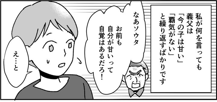 私が何を言っても義父は「今の子は甘い」「覇気がない」と繰り返すばかりです。息子は私と義父の顔色を伺いながら、返答に困っているようでした。