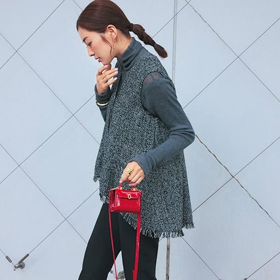 ②「いつもの黒パン×ツイードジレ」で黒のワントーンでも暗くならない!