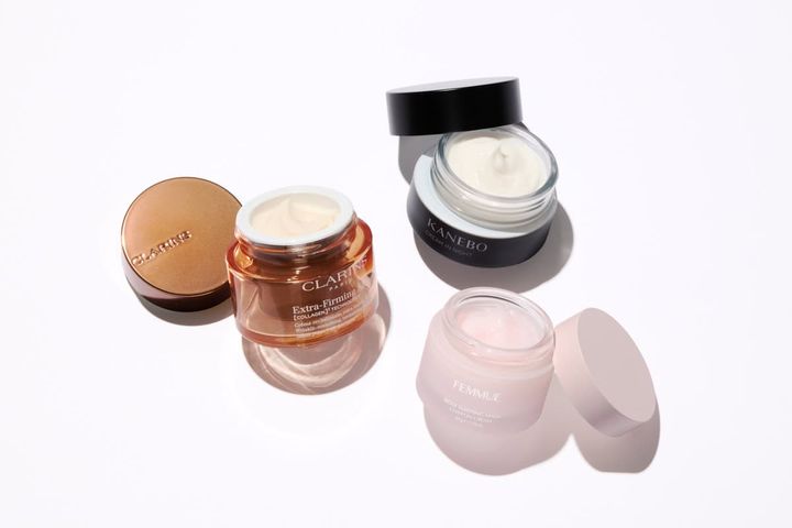 (上から時計回りに)赤ちゃんの肌を覆っているクリーム状の脂“胎脂”に着想を得た夜クリーム。柔らかくもっちりとした肌へ。カネボウ クリーム イン ナイトII 50g ¥12,500/カネボウインターナショナルDiv. 美容成分が豊富なダマスクローズウォーターを高配合し、眠っている間に肌を保湿・鎮静。ファミュ ローズウォーター スリーピングマスク 50g ¥4,290/アリエルトレーディング 夜間特有の肌メカニズムに着目した夜用エイジングケアクリーム。跳ね返すような弾力のあるハリ肌に。ファーミング EX ナイトクリーム N オールスキン 50ml ¥15,400/クラランス