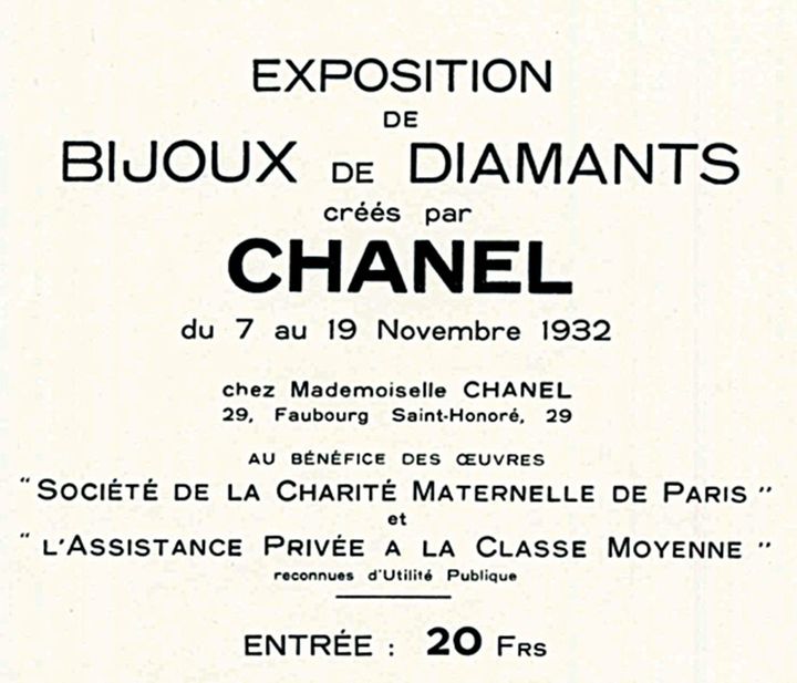 「ダイヤモンド ジュエリー」展の招待状。チケットは20フランで販売され、収益金は慈善団体に寄付されました。