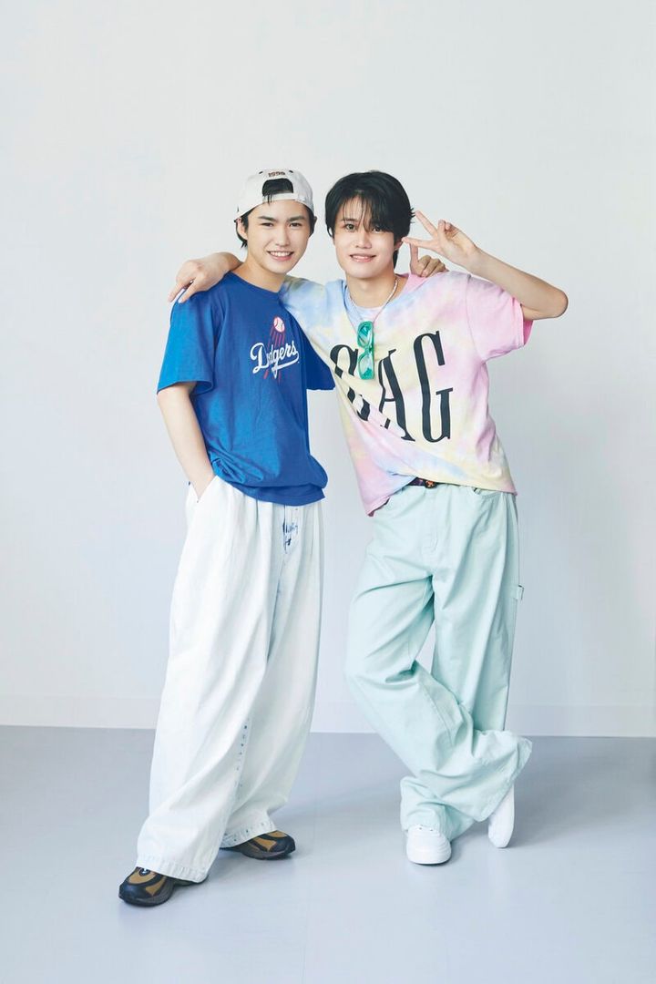 風雅「GAG……ぜったい私服では着やんやろうなっていうTシャツやけど(笑)、雑誌ってそういうの着たり、新しい発見がある機会じゃないですか? 色みとかもやし、いいなって思いました。こたちゃんはパンツ可愛いですよね」