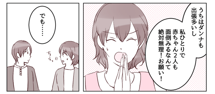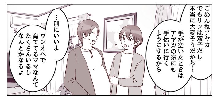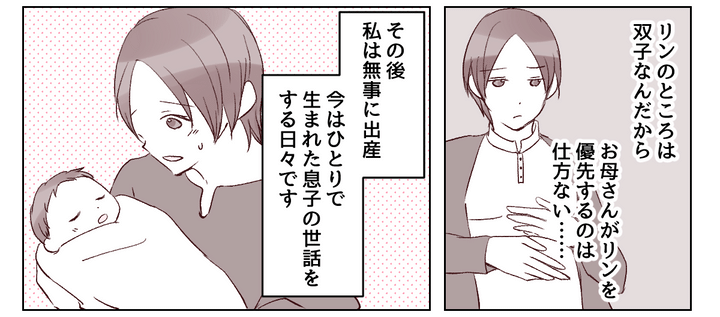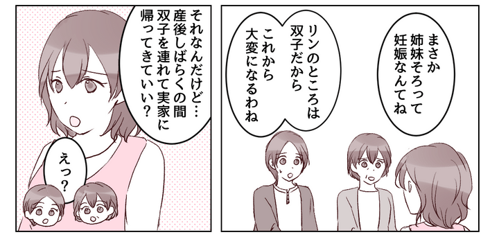リンは無事に双子の女の子を出産しました。それから間もなく、私も息子を出産しました。私たちが退院する頃には、実家は双子のお世話でてんてこまい……。両親はとても私のことまで気にかける余裕なんてないでしょう。