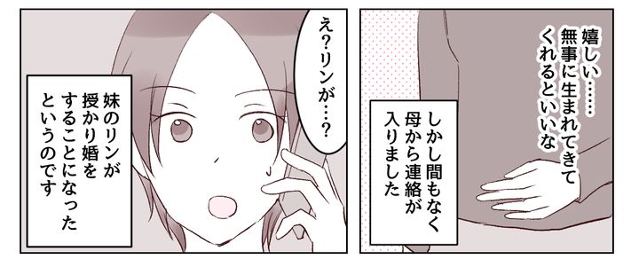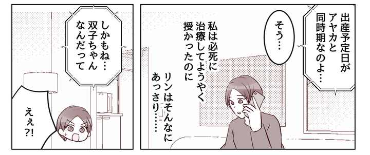 私はずっとツラい不妊治療をしてきて、ようやくわが子を授かることができました。けれどリンは結婚前にあっさり妊娠して授かり婚。なんだか軽すぎて釈然としません。リンのお腹にいるのが双子だと知って、いっそうモヤモヤが募ります。