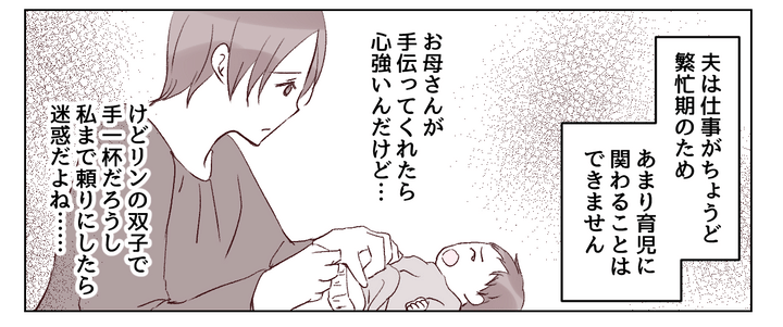 けれど夫の帰りが遅いわが家は、私がほぼひとりで育児に奮闘。私ははじめての育児への不安と、リンの出産への複雑な思いを抱えながら日々を過ごしていたのでした。