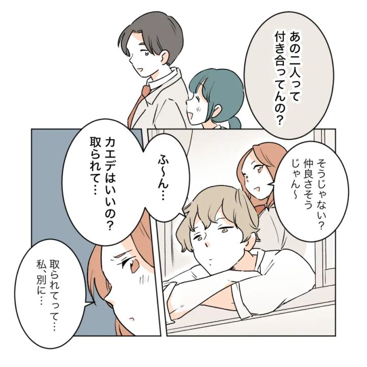 笑顔で話しながら仲良く帰宅するワタルとシズクの姿を校舎の窓から見かけたショウマが「あの2人って付き合ってんの?」とカエデに聞くショウマ。「そうじゃない?仲良さそうじゃん」と答えたカエデに、ショウマは「ふ~ん・・・カエデはいいの?取られて」と聞きました。カエデの気持ちを知っているようです。「取られてって、私、別に。」気持ちをごまかすカエデです。
