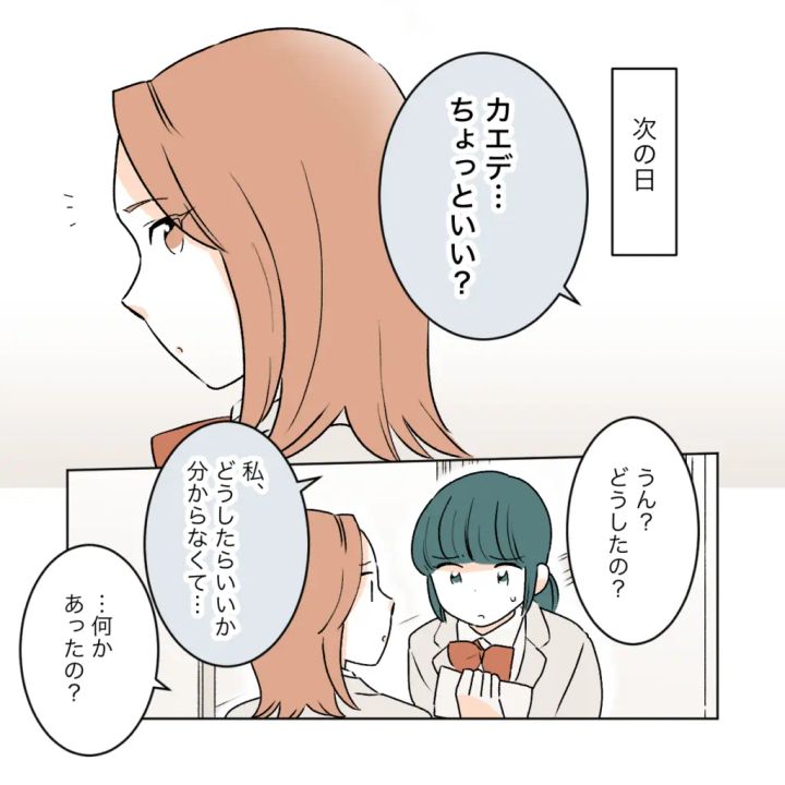 翌日、カエデはシズクに声をかけられました。申告そうな顔をして「私、どうしたらいいか分からなくて」と何かに怯えている様子です。「何かあったの?」と心配してカエデは聞きました。