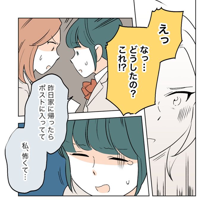手紙の内容を呼んだ瞬間、「えっ」と険しい表情になったカエデは「なっ・・・どうしたのこれ!?」と明らかに動揺している様子です。「昨日家に帰ったらポストに入ってて、私怖くて・・・」と言うシズクは今にも泣きだしそうです。