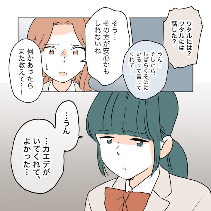 カエデが「ワタルには?ワタルには話した?」と聞くと、シズクは「うん。そしたら、しばらくそばにいるって言ってくれて。」と答えました。「そう・・・その方が安心かもしれないね。何かあったらまた教えて!」と本心で言ったカエデですが、カエデは自分に届いている手紙のことをワタルに話そうかと悩んだけれど、結局話せずに今に至るのです。「うん。カエデがいてくれて、よかった」弱弱しく言ったシズクです。