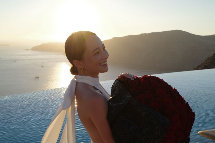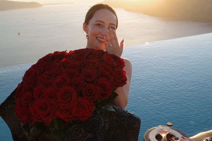 サントリーニ島でのプロポーズはサンセットを背景に、108本のバラの花束とともに