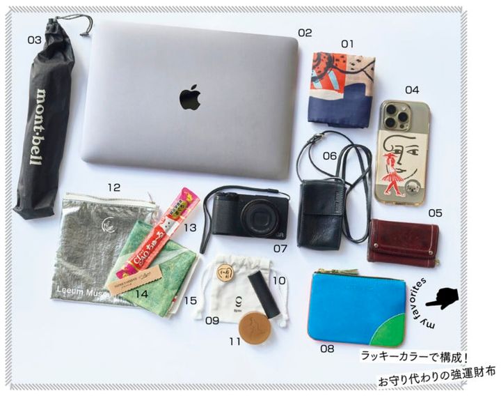 01エコバッグはフランスの美術館のお土産。02仕事の必需品のPC。03軽量なモンベルの折り畳み傘。04スマホケースには「マティス展」のリーフレットの切り抜きなどをIN。05アーペーセーのキーケースはボルドーカラーがポイントです。06ミュウミュウのシガレットケースは古着屋さんで購入。ストラップ付きで名刺入れとして活用。07リコーのコンデジで愛猫ばかり撮っています。08コムデギャルソンの財布は独立してからずっと愛用中。09ゴーエンのジュエリーポーチには10アニヴェンのブラウンリップ、11マルチに使えるリーカのトゥーバームを入れています。12韓国のリウム美術館で購入したポーチ。13行き倒れの猫に遭遇した時のために「チャオちゅ〜る」を携帯。14フランスで購入したパピエダルメニイのアロマペーパー。15東京都現代美術館で購入した美術作品がモチーフのハンカチ。