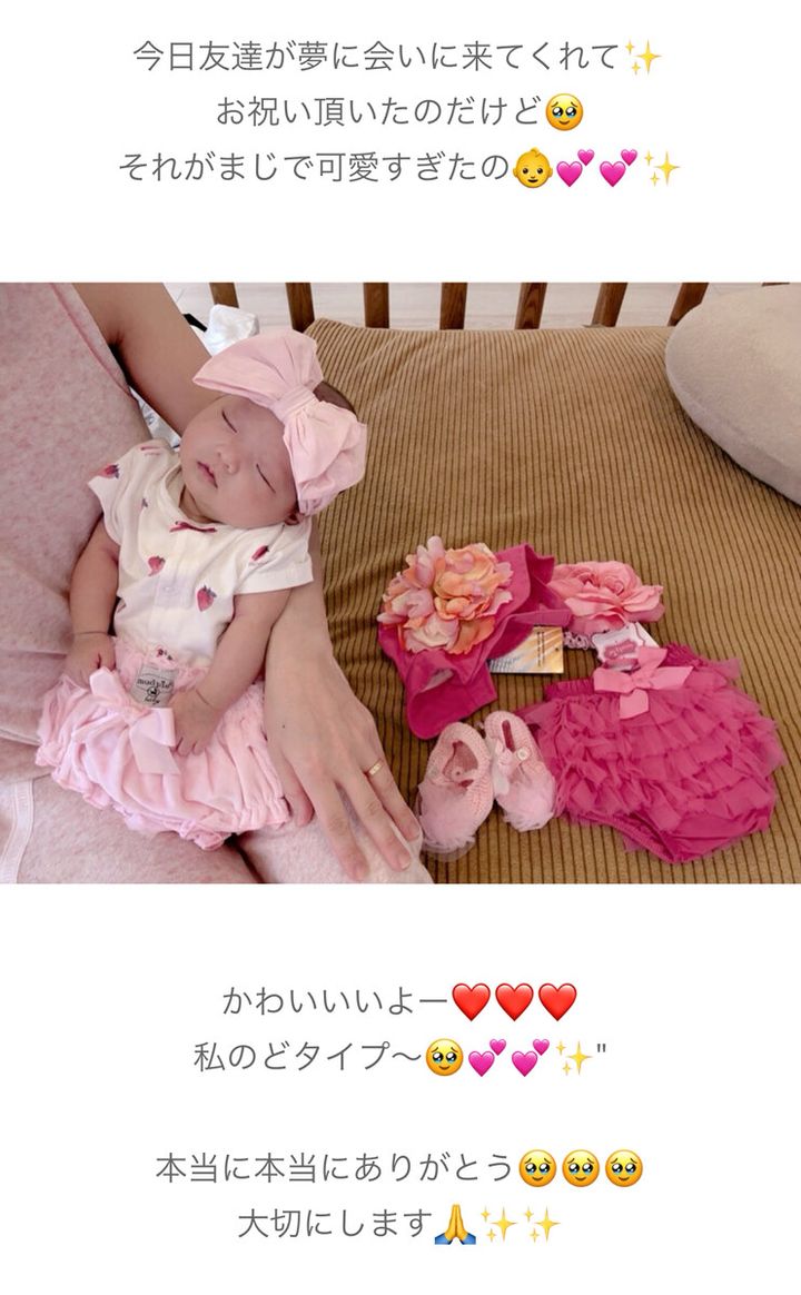 辻さんは「かわええええええ」と題したエントリーで、友人が出産祝いを持って会いに来てくれたことを報告。
