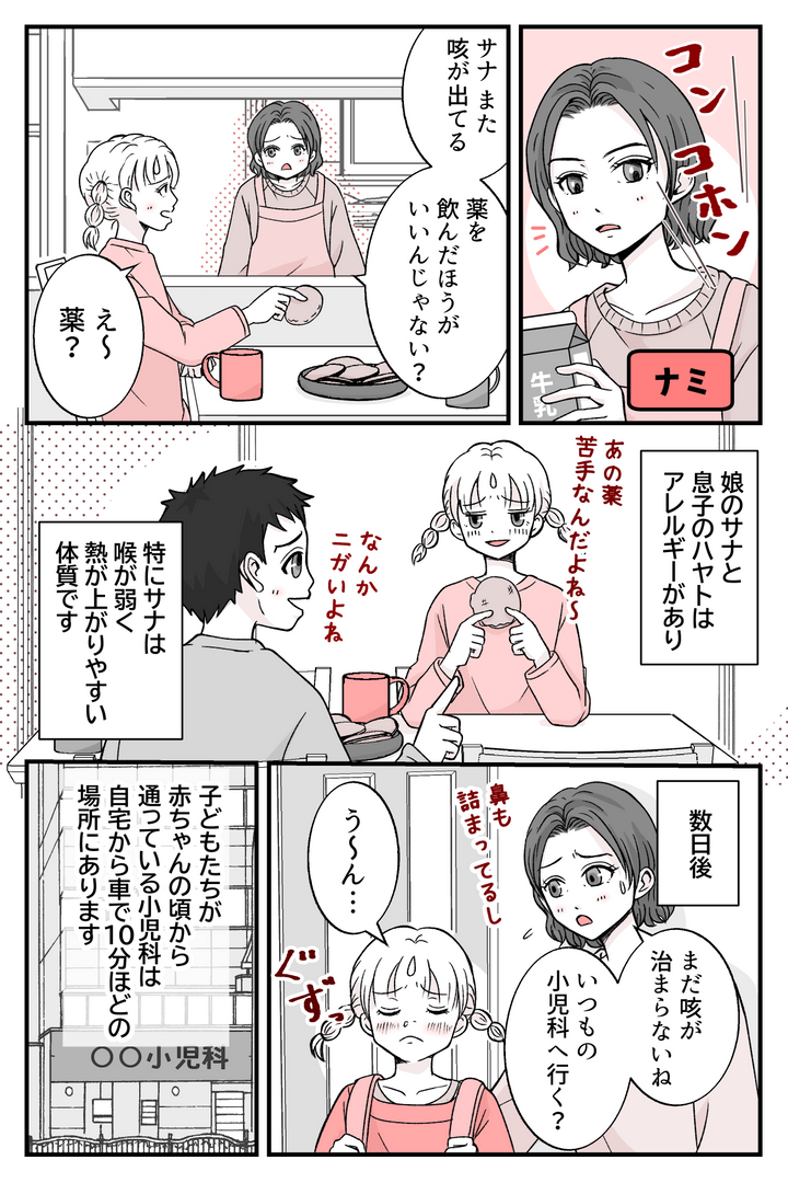 私(タカベナミ、40代)は小6の娘(サナ)と小3の息子(ハヤト)の母。子どもたちは2人ともアレルギーがあり、月に一度小児科に通っています。子どもたちが赤ちゃんの頃からお世話になっており、持病だけでなく風邪をひいたときでもその小児科に行きます。私たち親子は小児科のスタッフさんたちとも顔馴染みになっているので、私にとっては安心して通える場所です。私はまさかその小児科であんな思いをするとは思いませんでした。