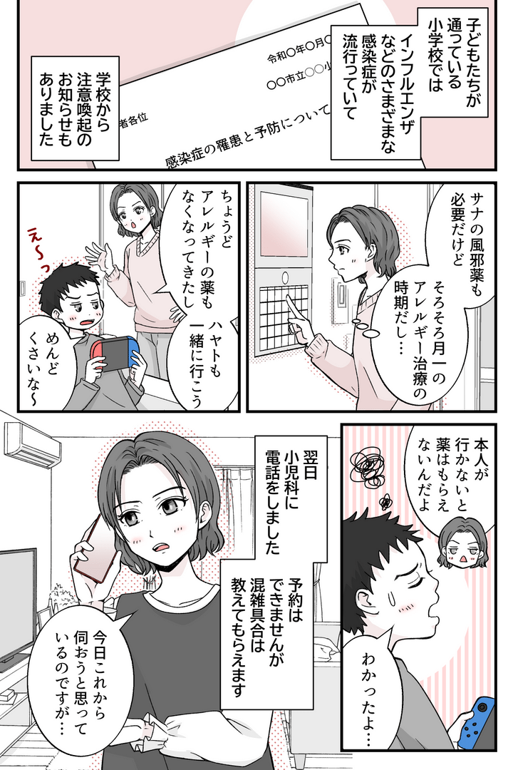 子どもたちは2人ともアレルギー治療のため、月に一度小児科へ通院しています。私は娘の風邪薬の他に、子どもたちのアレルギーの薬ももらいたかったのです。翌日、ちょうど子どもたちの塾や習い事がなく、私も早く仕事を上がれそうだったので、小児科に電話しました。予約はできませんが、電話すれば混雑具合を教えてくれます。