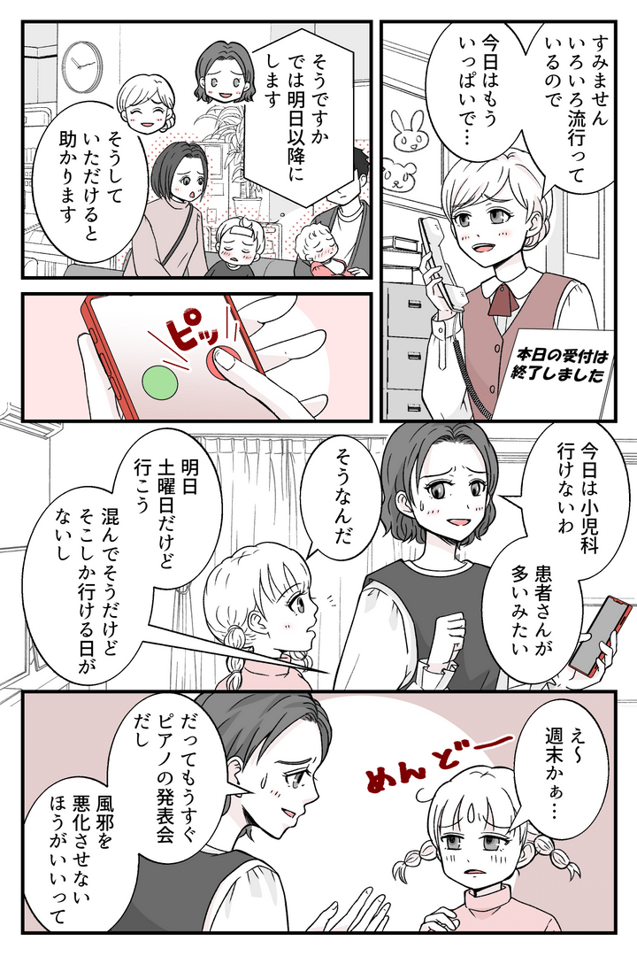 昨年の大晦日、娘は発熱で三が日を寝込んですごしました。そのため楽しみにしていた親戚宅への訪問など、予定していたことがすべてキャンセルになり、娘はとても悲しい思いをしたのです。同じ思いをしないためにも、早く診察を受けてほしいのです。小児科の休診日や私の仕事、子どもたち2人の予定を考慮すると、その土曜日しか小児科へ行くチャンスがありません。ある程度の混雑を覚悟して向かうことに決めました。