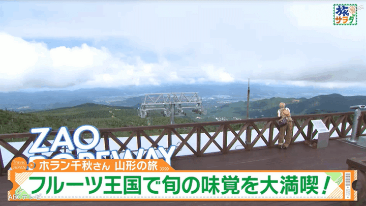 山形の風景を楽しみたいとホランが向かったのは、豊かな自然と温泉で有名な蔵王だ。彼女は、ロープウェイで空中散歩を楽しみ、少々寒いほどの涼しさに驚き、眼下に広がる景色に、「すご~い! 目線の先に雲!」と感動! 絶景を近くで見ようとデッキの手すりに駆け寄り、「気持ちいいね~風もちょうどいい~!」と大喜びし、遠くへ向かって「ヤッホ~!」と叫び、子どものようにはしゃいだ。