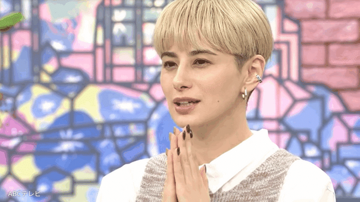ホランは、長らく黒髪ショートを貫いてきたが、『Nスタ』卒業を機に金髪へカラーチェンジ!さらには、肩まで伸びたウェーブヘアから、サイドと襟足を刈り上げたハンサムショートにし、雰囲気をガラリと変えた。