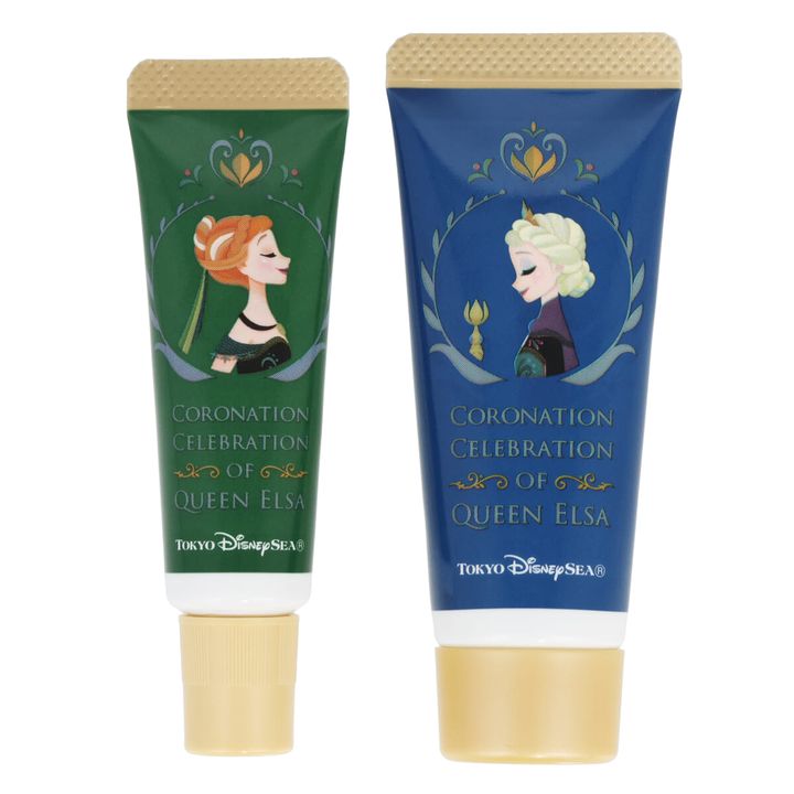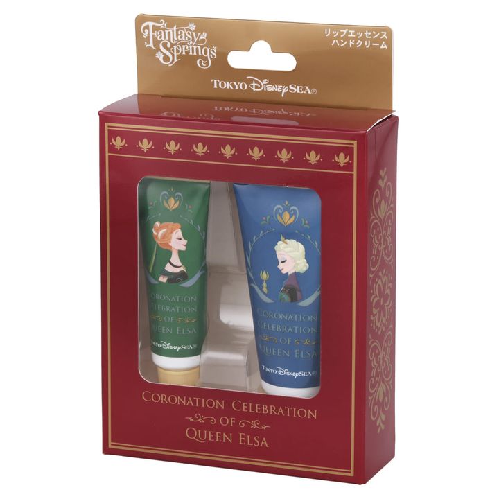 「アナ」と「エルサ」がそれぞれデザインされたリップエッセンスとハンドクリームのセット。