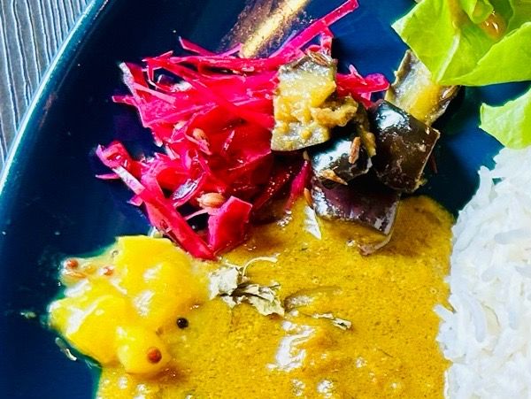 更に、この日の副菜は「ゴボウのサブジ」「茄子スパイス」「紫キャベツラペ」の3種。これがまた、組み合わせを選びながら味変する楽しみを与えてくれます。副菜3種も週毎に変わるそう。
