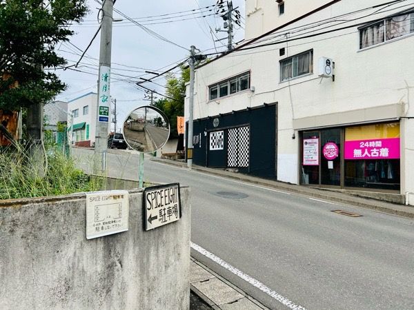 坂の途中、オレンジの旗が見えてきます。その手前のこちらが駐車場です。
