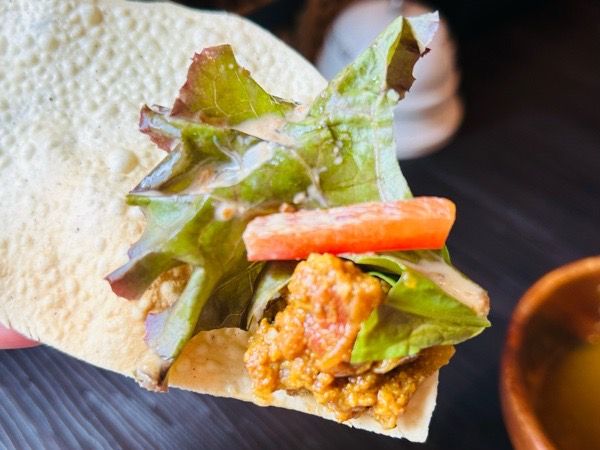 自家製ドレッシングのサラダとキーマカレーをパパド(豆せんべい)に乗せて食べてみたらこれまた美味。サラダとパパドは日替わりではなく常に添えてあるのは有り難い。パパドをカレーの上に砕いて食べるお客さんもいるとのこと♪