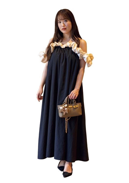 「ワンピースはTHE TOÉ。女子会のときは大人っぽさと可愛さのバランスに気をつけていて、上品なワンピでもどこか凝ったデザインが効いているものを選んだり、髪の毛はしっかり巻いて、きれいめアクセで盛り上げます」(金融会社勤務/塩島真実さん・31歳)