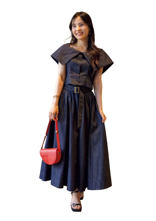 「女子会には、着るだけでパッとおしゃれ感が高まるワンピースやセットアップをよく着ます。FUKI CAMMYのトップス&スカートは、ドレスライクに見えつつカジュアルなデニム素材で抜け感もあるところがお気に入り」(商社勤務/立川怜那さん・31歳)