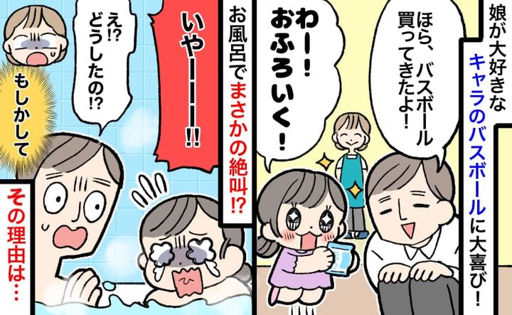 娘が2歳のころの出来事です。娘は、あるキャラクターが大好き!きっと喜ぶだろうと、夫がそのキャラクターのバスボールを買ってきました。最初は大喜びしていたのですが、いざ袋を開けた瞬間、娘の表情が曇り始めて……。