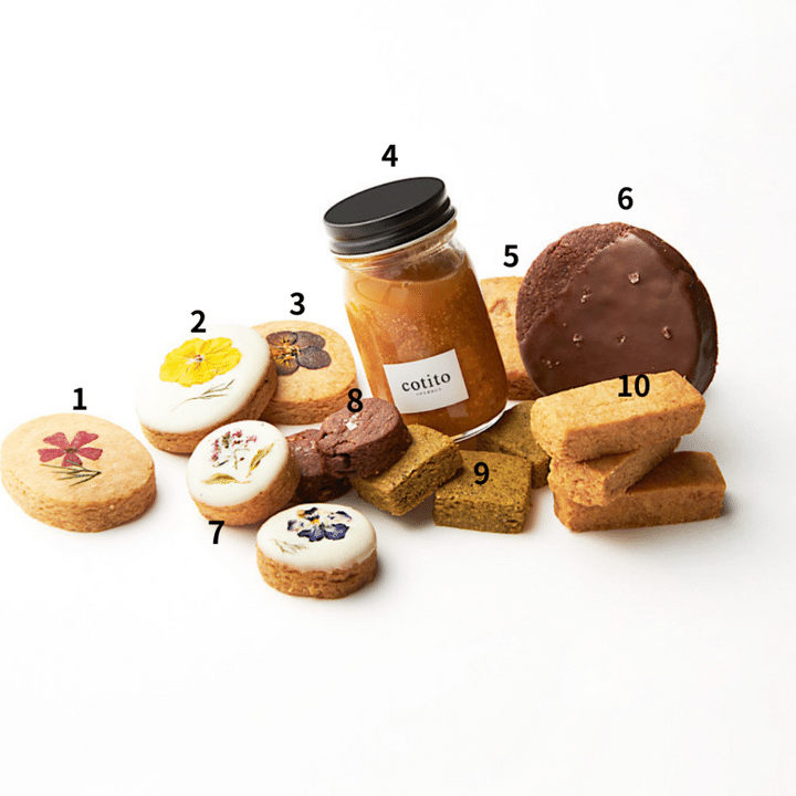 1.ハナサブレ(プレーン)2.ホワイトチョコのサブレ(カモミール)3.ハナサブレ(米粉)4.ピーナッツバター5.ジンジャーホワイトチョコサブレ6.ソルトチョコレートクッキー7.お花とホワイトチョコのクッキー8.アーモンドビターチョコソルト9.コチトクッキー(煎茶)10.コチトショートブレッド