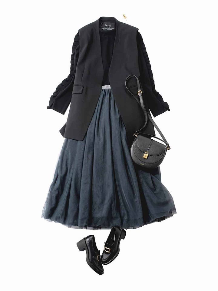 ふんわりとしたチュールの黒スカートは、甘さと上品さを両立した万能アイテム。カジュアルもキレイめもお任せですが、モードに仕上げたい時はマニッシュなジャケットを羽織って甘さを中和。シックな黒小物でまとめれば、上品さが際立つ仕上がりに。華やかさと落ち着きの両方を欲張れるスタイルです。