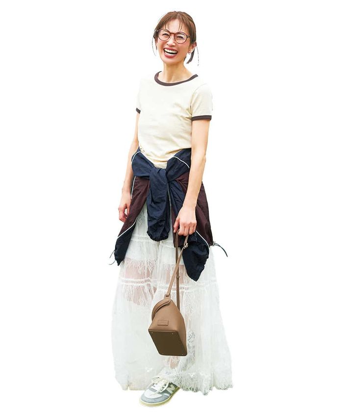 繊細なレースのロングスカートも、透け感を楽しむ最旬のデザイン。そのまま甘く着ると子供っぽくなりがちなので、シンプルなTシャツやスニーカーでカジュアルダウンするのが正解です。ウエストに軽くブルゾンを巻けば、視線が上に集まりスタイルアップ効果も。