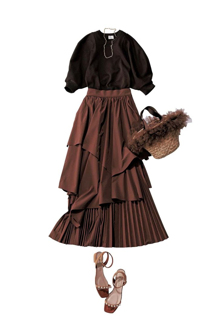 段々に重なったティアードとプリーツが視線を集める、存在感たっぷりのロングスカート。リッチなブラウンカラーなら甘さが抑えられて上品に着こなせます。トップスはシンプルな黒を合わせて引き算するのがポイント。小物で遊べば、おでかけ仕様の華やかフェミニンが完成します。