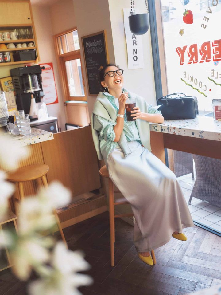 サテンスカート¥20,900(ル フィル/ル フィル ニューマン新宿店)シャツ¥18,700ニット¥17,600(ともにアルページュストーリー/アルページュストーリー プレスルーム)タンクトップ¥8,580(スローン/ザ ショップ スローン 神戸)バッグ¥86,900(メゾン カナウ/ヤマニ)パンプス¥69,300(ペリーコ/アマン)メガネ¥42,900(アイヴァン/アイヴァン 東京ギャラリー)ピアス¥25,300(Kara Yoo/TOMORROWLAND)バングル¥30,360(アドラル/ZUTTOHOLIC)