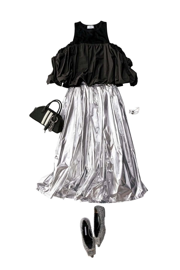 華やぎもアクセントも今っぽさも、1着でコーデを完結させてくれるデザインが欲しいなら、メタリックなシルバースカートが断然おすすめ。存在感抜群のロングスカートは、シンプルなトップスを合わせるだけで、最高のバランスでコーデが完成。あえてボリューム感のある黒トップスを合わせれば、メリハリの効いたモードな雰囲気に。