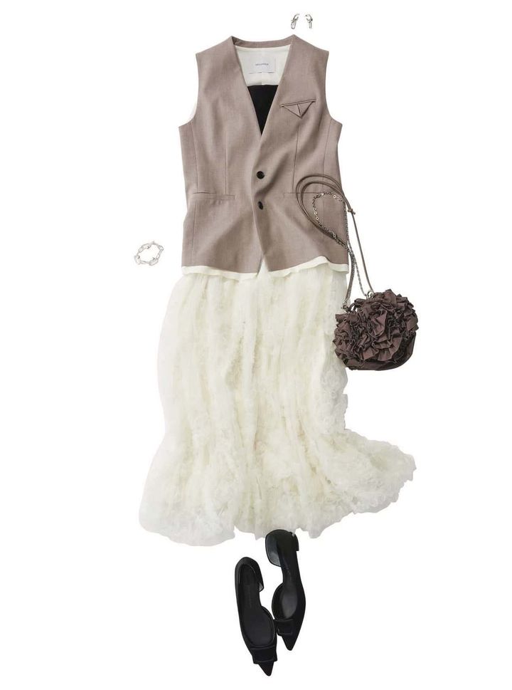 ジレ×スカートでつくる、甘ニッシュコーデ。ふんわりとしたシルエットのチュールスカートで可愛らしさを出しつつ、トレンドデザイン×上品な秋カラーのジレで程良くきちんと感をプラス。柔らかなカラーで統一して、親しみやすい印象に。足元は、ブラックのパンプスでパキッと引き締めて。