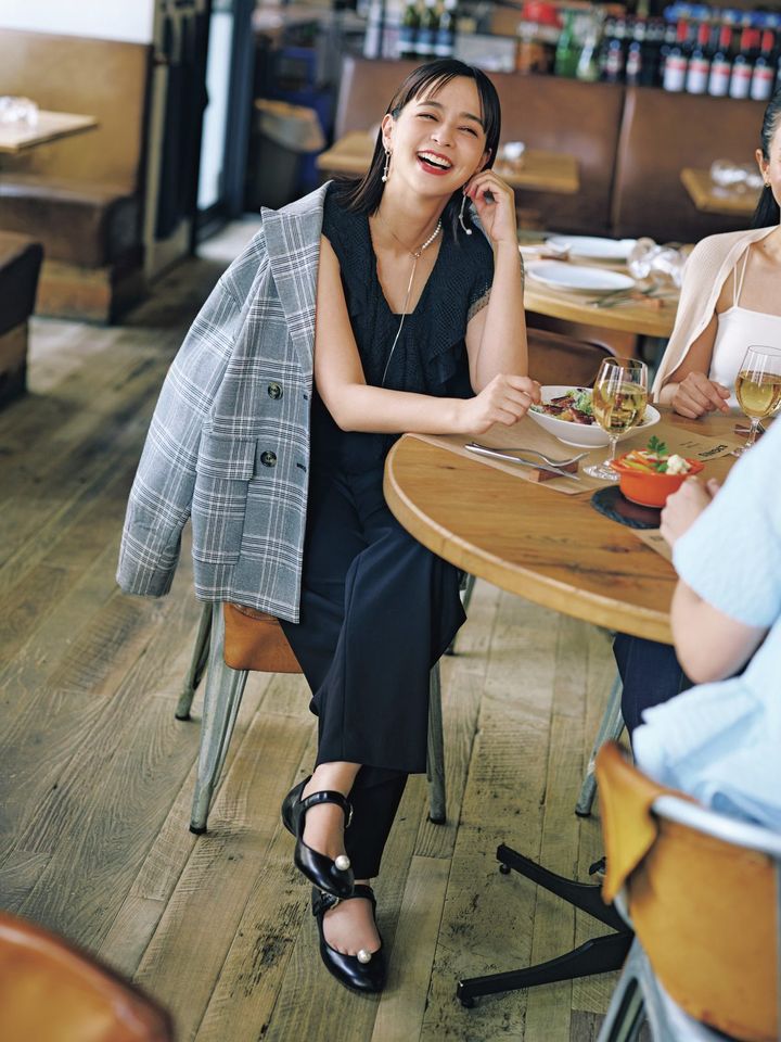 キャミオールインワン¥59,400(デパリエ)ブラウス¥29,700(デパリエ)バッグ¥59,400(ヴァジック/ヴァジックジャパン)靴¥26,400(銀座かねまつ/銀座かねまつ6丁目本店)メガネ¥42,900(アイヴァン/アイヴァン 東京ギャラリー)ピアス各¥23,100(マユ/マユ ショールーム)