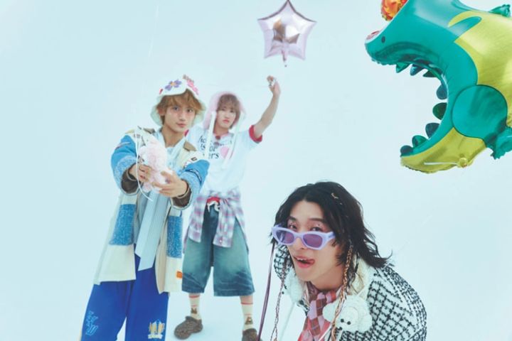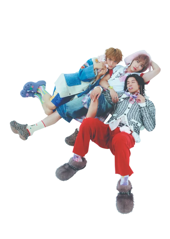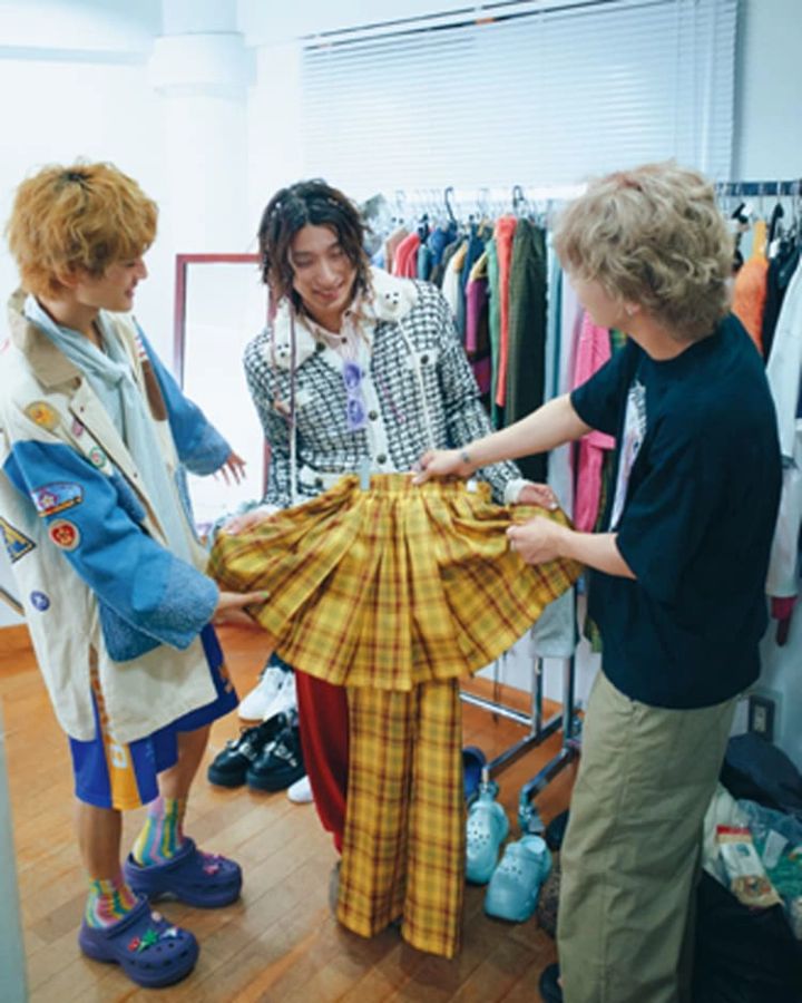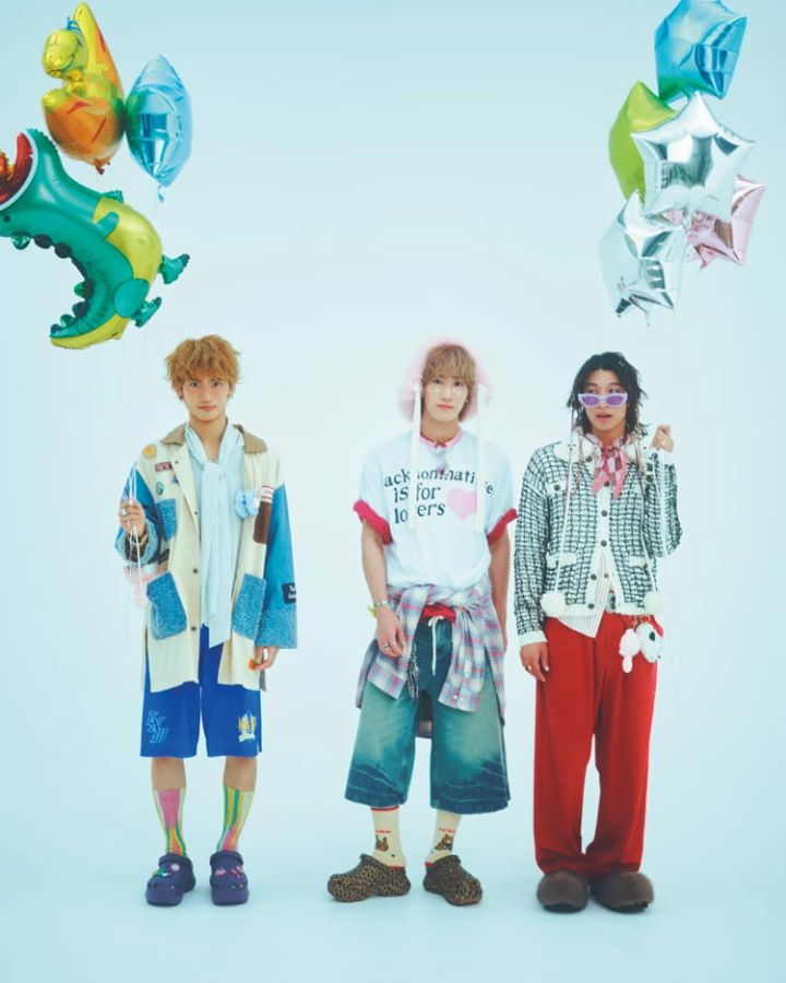 〈右・古幡のコーデ〉ジャケット 17,160円、シューズ 28,050円/ともにLECYTO(HANA KOREA)シャツ 27,500円/キジュン(blase out)パンツ 24,200円/カネマサフィル サングラス 24,420円/レイバン(ルックスオティカジャパン)スカーフ 14,300円/ダックス(三共生興ファッションサービス)猫のキーホルダー 880円、肉球のキーホルダー 1,000円/ともにSPINNS その他/スタイリスト私物〈中央・福澤のコーデ〉Tシャツ 14,300円/ジャクソンマティス(ハンドイントゥリーショールーム)下に着たTシャツ 12,800円/XOXOGOODBOY、シャツ12,030円/DNSR(ともにHANA KOREA)ショーツ 5,499円/WEGO バラクラバ 4,900円/イプゴ(blaseout)サングラス 73,920円/オリバーピープルズ(ルックスオティカジャパン)ネックレス 3,520円/オイル(ジョワイユ)ソックス 1,650円/ホイサム ヘアゴム 300円/WEGO サンダル 11,000円/クロックス その他/スタイリスト私物〈左・髙橋のコーデ〉ジャケット 31,900円/マスターキー(ティーニー ランチ)シャツ 26,400円/クメ(blaseout)ショーツ 4,399円、バンズ 300円/ともにWEGO ソックス 2,750円/ホイサム サングラス 24,420円/レイバン(ルックスオティカジャパン)サンダル 11,000円/クロックス(クロックスカスタマーサポート)その他/スタイリスト私物