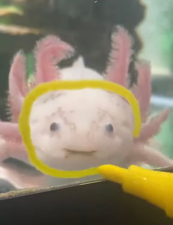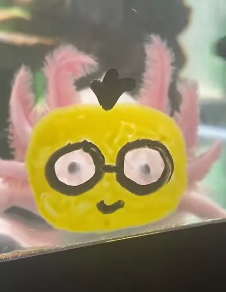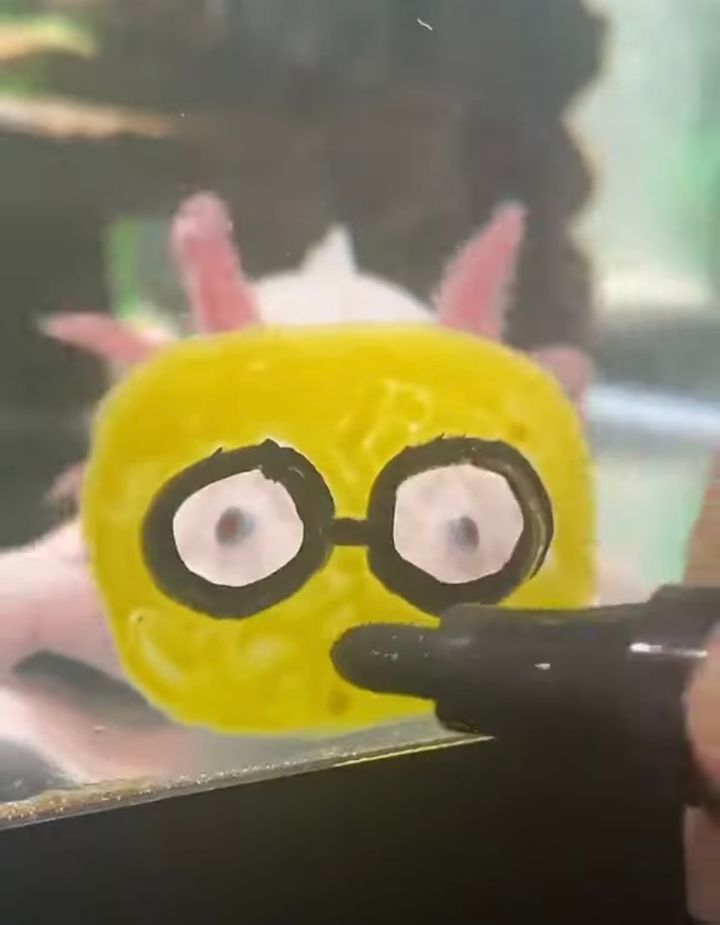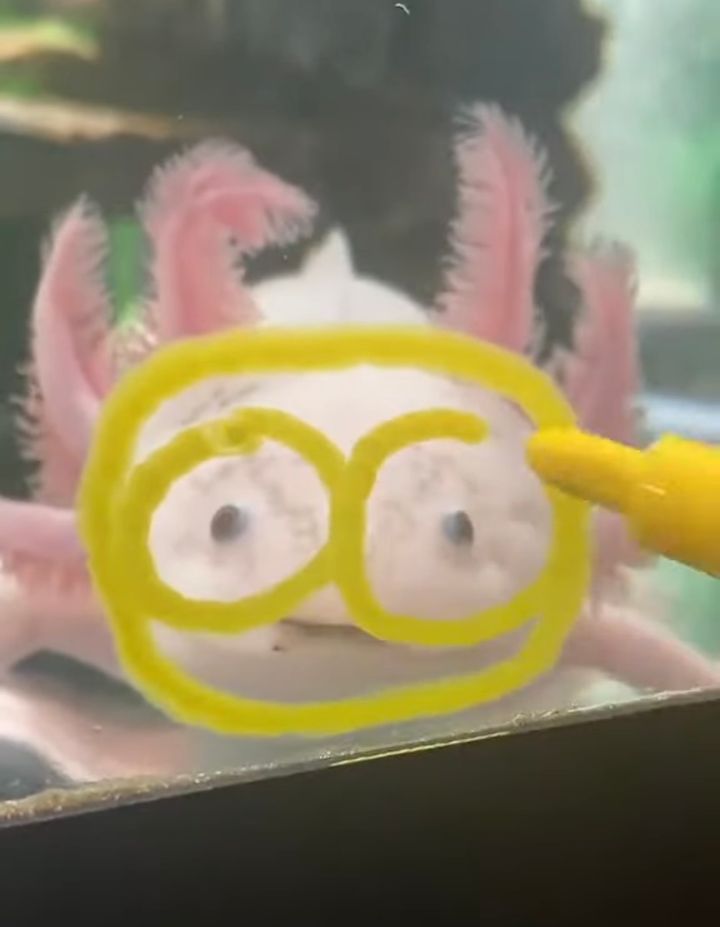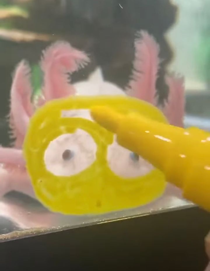 撮影者さんは、水槽の中からこちらを見つめてきてるウーパールーパーの顔に落書きをするかのように、水槽のガラスの上から黄色のペンを走らせました。