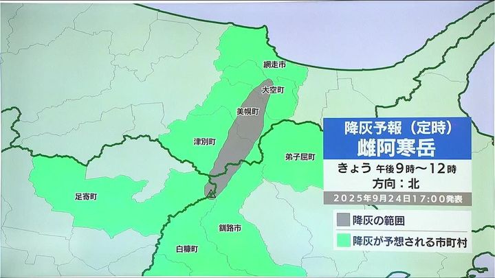 まず今夜6時から9時。上空は南風が吹くので噴火した場合、噴煙は美幌町など北に流れます。