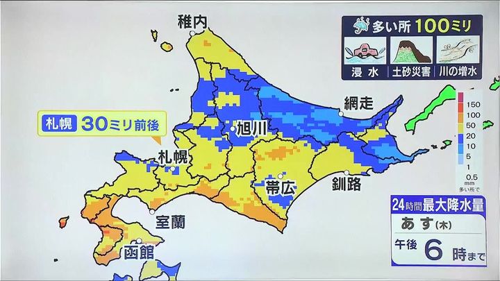 雷を伴った1時間に30ミリの激しい雨、突風の発生するおそれもあります。また、札幌周辺など通勤通学が雨や風のピークとなるため、最新の交通情報も確認して下さい。