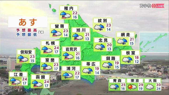 あす25日(木)明け方になると道央や道南から雨が強まります。
