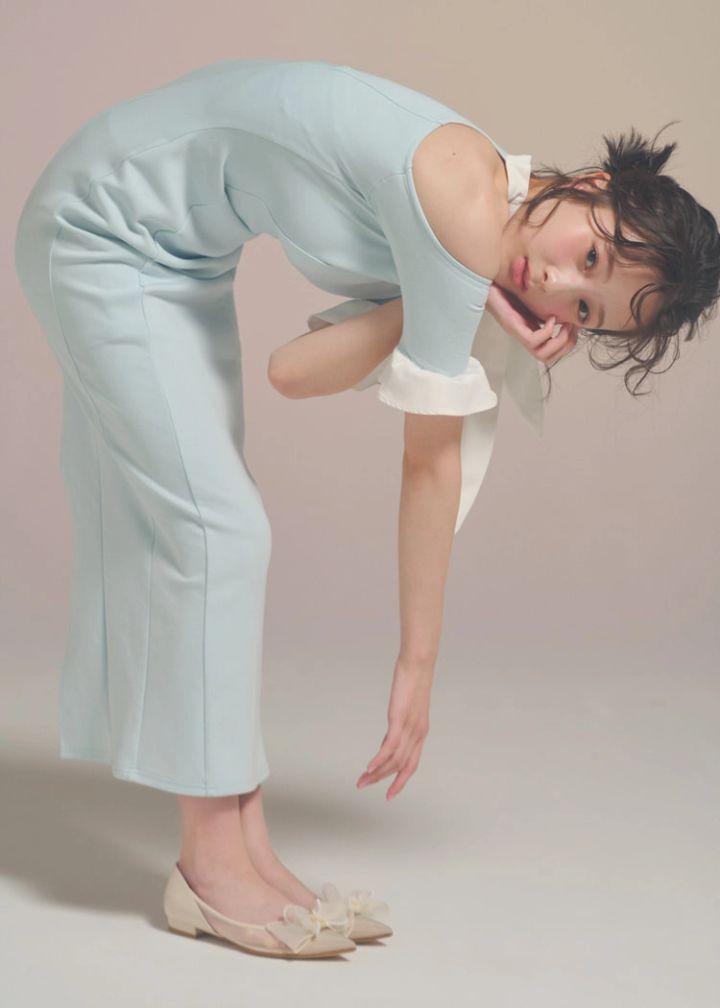 フリルやリボンの甘〜いディテールもちょっぴりラフなデザインも繊細な印象に変えてしまうのがシュガーブルーのなすべきワザ。