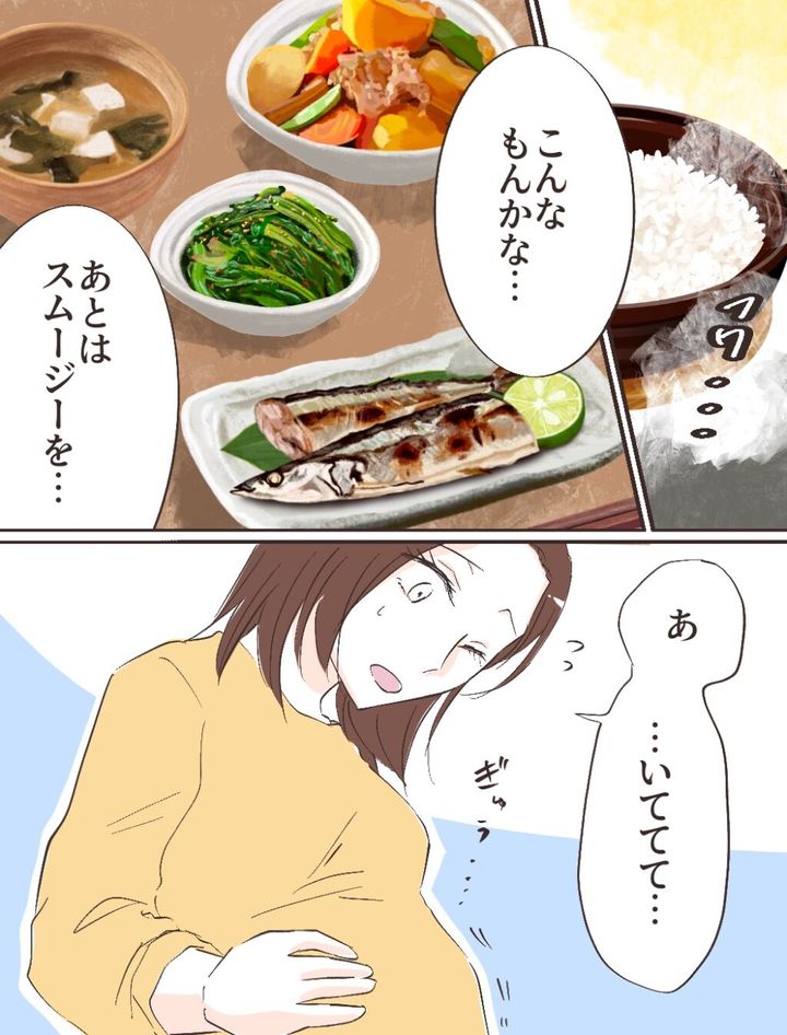 リヒトさんを見送った後は、帰宅時間を考えながら栄養バランスの取れた朝食を急いで準備。リヒトさんが朝食を食べ始めるタイミングに合わせてスムージーも準備します。今日の朝食は炊き立てのご飯、焼き魚、肉じゃが、お浸し、お味噌汁。「こんなもんかな・・。あとはスムージーを・・」と慌ただしく準備していると、「あ・・いててて・・」急にお腹がぎゅうっと張るのを感じました。