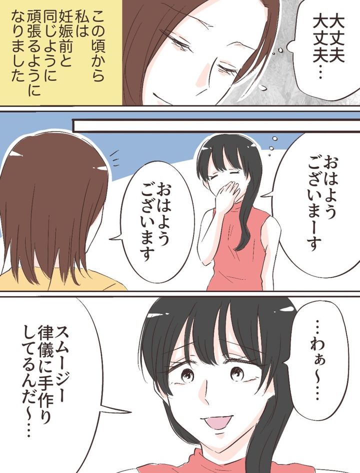 それでも・・私はお腹をさすりながら「大丈夫、大丈夫・・」と自分に言い聞かせて家事を続けました。この頃から、私は妊娠前と同じように頑張るようになりました。私が慌ただしく朝食の準備をしていると、「おはようございまーす」とユウコさんがあくびをしながらのんびりと起きてきました。そして、バタバタと動き回る私を見て、ユウコさんは「・・わぁ~・・。スムージー律儀に手作りしてるんだ~・・」と呟きました。ユウコさんも今まではリヒトさんのために毎朝手作りスムージーを作っていたはずなのに・・どういう意味なのでしょうか。
