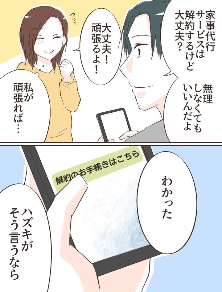 ハズキさんが家事を頑張ると言ったとき、リヒトさんが解約するべきなのは家事代行サービスではなくユウコさんの方ですよね。自分のことしか考えていないリヒトさんのために無理をしてしまうハズキさんが心配です。