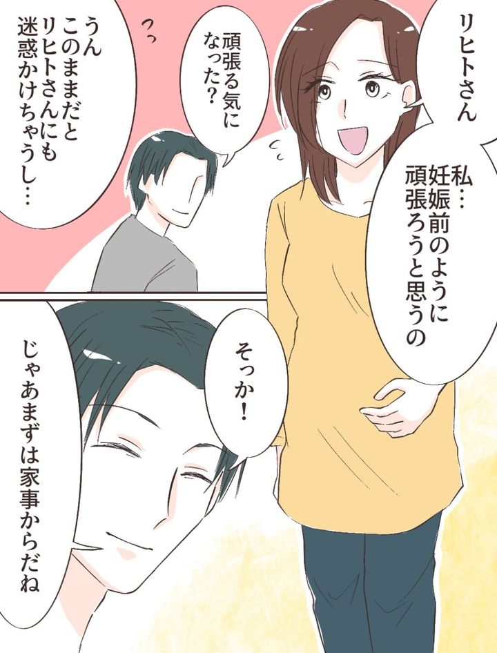 ユウコさんに早く家から出ていってもらいたい一心の私は、そのためには自分が家事もリヒトさんのサポートも完璧にしなければと思い「リヒトさん、私・・妊娠前のように頑張ろうと思うの」とリヒトさんに切り出しました。「頑張る気になった?」とリヒトさんに聞かれ「うん。このままだとリヒトさんにも迷惑かけちゃうし・・」と答えると、「そっか!じゃあまずは家事からだね」とリヒトさんは優しく微笑みました。