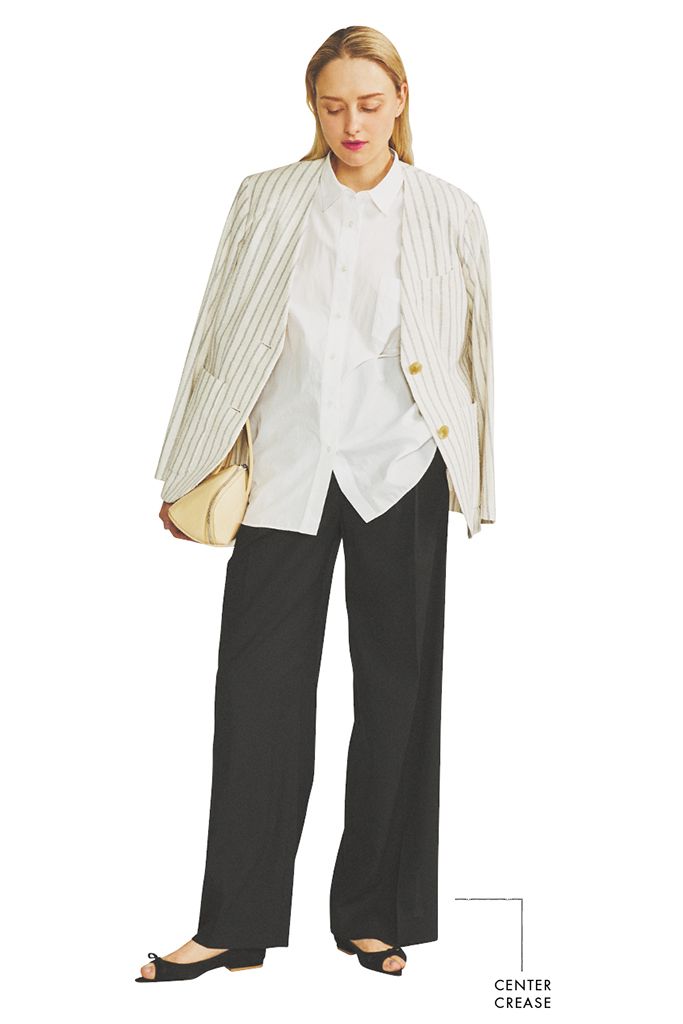 体との間に適度なゆとりを持たせることで、着ていてラクなうえに「こなれ感」につながる抜けをメイク。サイズのギャップでストイックなIラインとはまた違う華奢さを演出。 ストライプジャケット/THE SHINZONE 黒パンツ/フランケン