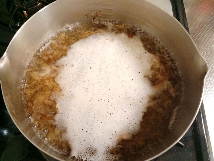 沸騰したら火を止めてアクを取ります。