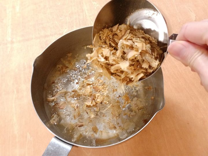 3. 鍋に水とかつお節を入れ火にかけ、沸騰したら火を止めてかつお節を取り出す。