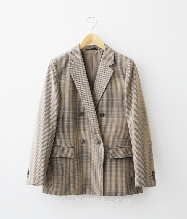 おしゃれがいちばん楽しい季節、秋に向かって、1 着持っていると便利なジャケットを見つけました。ブラウン系のガンクラブチェック柄の正統派。