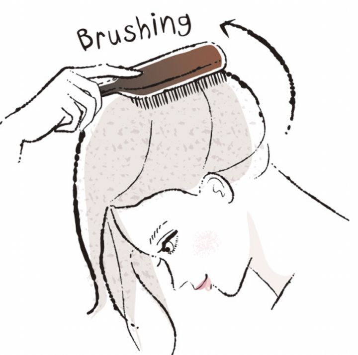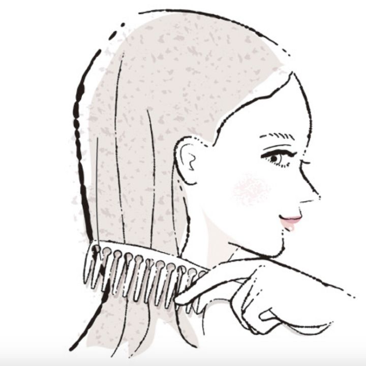 左の髪は右へ、右の髪は左へ、前の髪は後ろへ、後ろの髪は前へと、逆毛を立てるようにとかす。